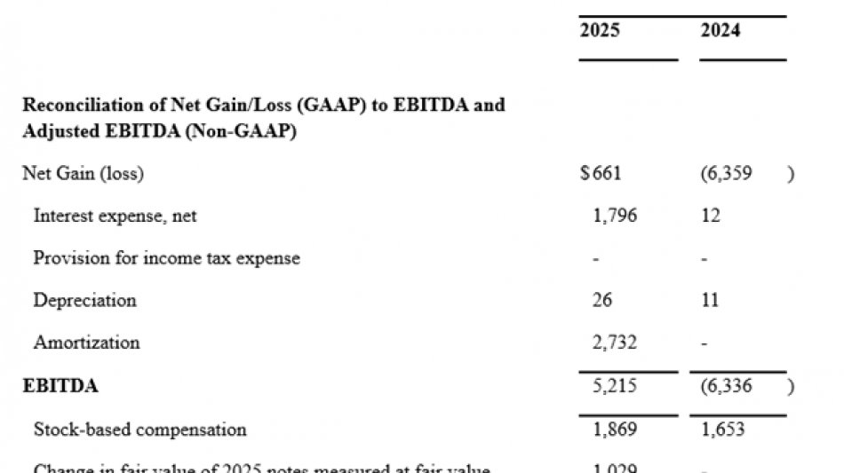 Der Bruttogewinn belief sich für das am 31. Dezember 2025 endende Geschäftsjahr auf 30 Millionen $ (Bruttomarge ~78 %), verglichen mit 376.000 $ (Bruttomarge ~14 %) für das am 31. Dezember 2024 endende Geschäftsjahr.